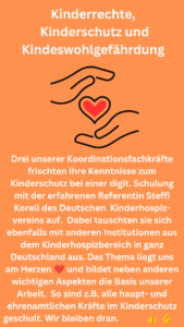 Drei unserer Koordinationsfachkräfte frischten ihre Kenntnisse zum Kinderschutz bei einer digitalen Schulung mit der erfahrenen Referentin Steffi Korell des Deutschen Kinderhospizvereins auf. Dabei tauschten sie sich ebenfalls mit anderen Institutionen aus dem Kinderhospizbereich in ganz Deutschland aus. Das Thema liegt uns am Herzen und bildet neben anderen wichtigen Aspekten die Basis unserer Arbeit. So sind […]